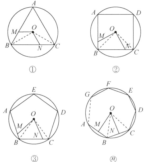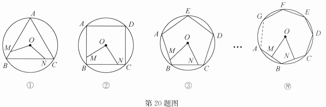 20. (15 分)如图①,②,③,…,⑩,点 M,N 分别是⊙O 的内接正三角形 ABC,正方形 ABCD,正五边形 ABCDE,…,正 n 边形 ABCDEFG…的边 AB,BC 上的点,且 $BM = CN$,连接 OM,ON。