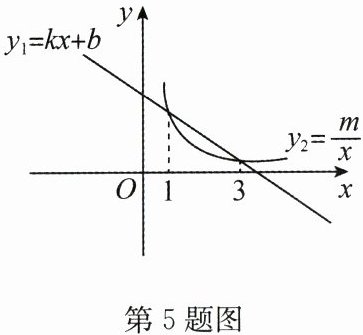 5. 已知一次函数$y_1 = kx + b(k \neq 0)$与反比例函数$y_2 = \frac{m}{x}(m \neq 0)$的图象如图所示,当$y_1 > y_2$时,自变量$x(x > 0)$满足的条件是