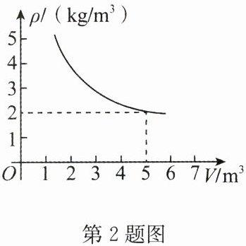 2. 在一个可以改变体积的密闭容器内装有一定质量的二氧化碳气体,当改变容器的体积时,气体的密度也会随之改变,密度$\rho$(单位:$kg/m^3$)是体积$V$(单位:$m^3$)的反比例函数,它的图象如图所示.当$V = 10\ m^3$时,气体的密度是