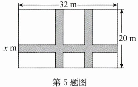 5. 如图,某小区计划在一块长为32m,宽为20m的矩形空地上修建三条同样宽的道路,剩余的空地上种植草坪,使草坪的面积为$570m^{2}$。若设道路的宽为$x m$,则下面所列方程正确的是(