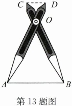 13. 如图,比例尺是一种画图工具,它由长度相等的两脚$AD$和$BC$交叉构成。利用它可以把线段按一定的比例伸长或缩短。如果把比例尺的两脚合上,使螺丝钉固定在刻度为$3$的地方(即同时使$OA = 3OD$,$OB = 3OC$),然后张开两脚。若此时$CD = 2$,则$AB =$