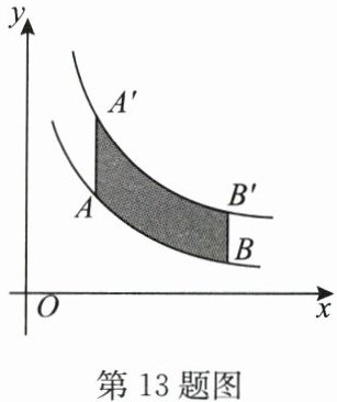 13. 如图,点 $ A(m, 2) $,$ B(5, n) $ 在函数 $ y = \frac{k}{x} (k > 0, x > 0) $ 的图象上,将该函数图象向上平移2个单位长度得到一条新的曲线,点 $ A $、$ B $ 的对应点分别为 $ A'$、$ B' $.图中阴影部分的面积为8,则 $ k $ 的值为