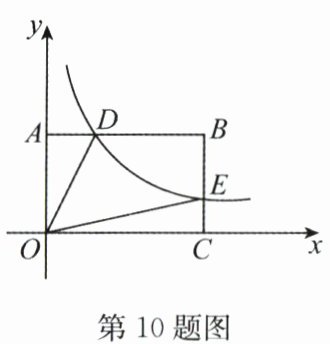 10. 如图,在平面直角坐标系中,反比例函数 $ y = \frac{k}{x} (x > 0) $ 的图象交矩形 $ OABC $ 的边 $ AB $ 于点 $ D $,交边 $ BC $ 于点 $ E $,且 $ BE = 2EC $.若四边形 $ ODBE $ 的面积为6,则 $ k = $