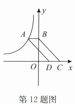12. 如图,点 $ A $ 是反比例函数图象上一点,过点 $ A $ 作 $ AB \perp y $ 轴于点 $ B $,点 $ C $、$ D $ 在 $ x $ 轴上,且 $ BC // AD $,四边形 $ ABCD $ 的面积为3,则这个反比例函数的解析式为
