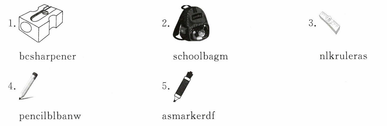1.sharpener 2.schoolbag 3.ruler 4.pencil 5.marker