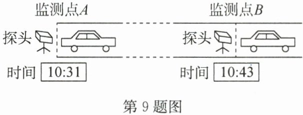 9. “区间测速”目前在全国大部分高速公路实行。所谓的“区间测速”,就是在两监测点安装监控和测速探头,测出同一辆车通过两个监测点的时间,如果这个平均车速超过了该路段的最高限速,即被判为超速。如图所示,监测点A、B相距30km,一辆轿车通过监测点A的速度为100km/h,通过监测点B的速度为110km/h,该路段最高限速为120km/h。