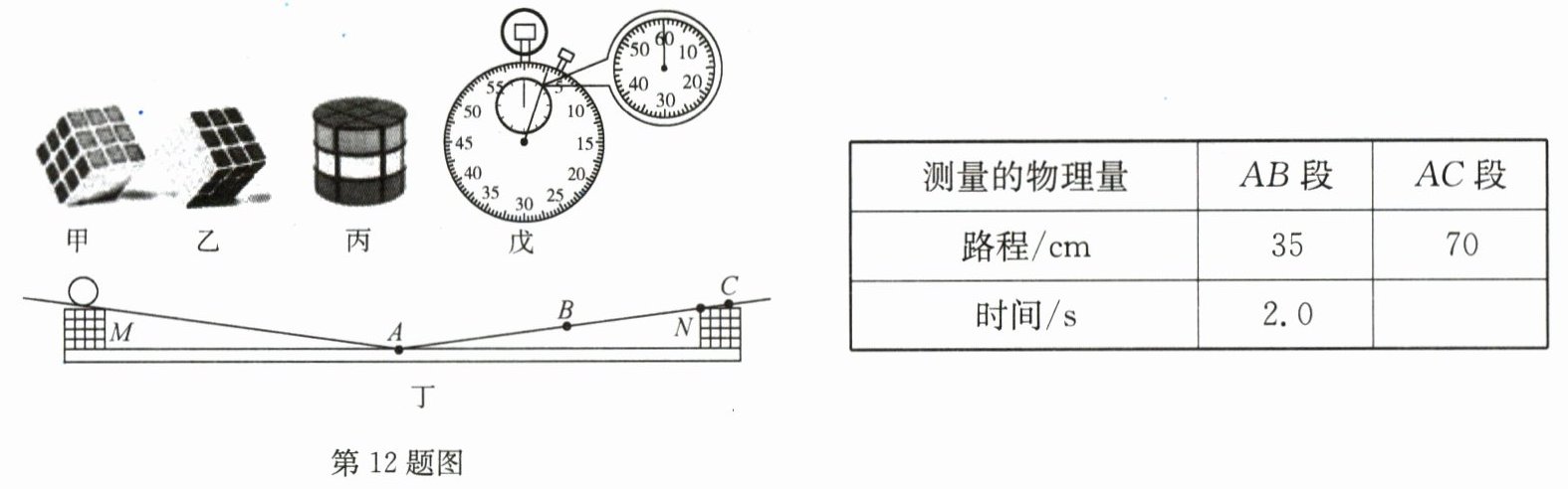 12. 小昊是地地道道的“魔方迷”,家里有各种各样的魔方,如图甲、乙和丙所示。学习物理知识后,善于思考的小昊想借助于刻度尺和秒表来测量圆柱形魔方丙滚上斜面的平均速度,于是小昊找来了两个大小和形状均相同的正方体魔方甲和乙,借助于两块相同的长木板搭建了两个斜面,如图丁所示,并做了如下探究实验。