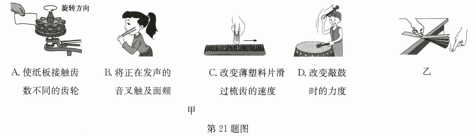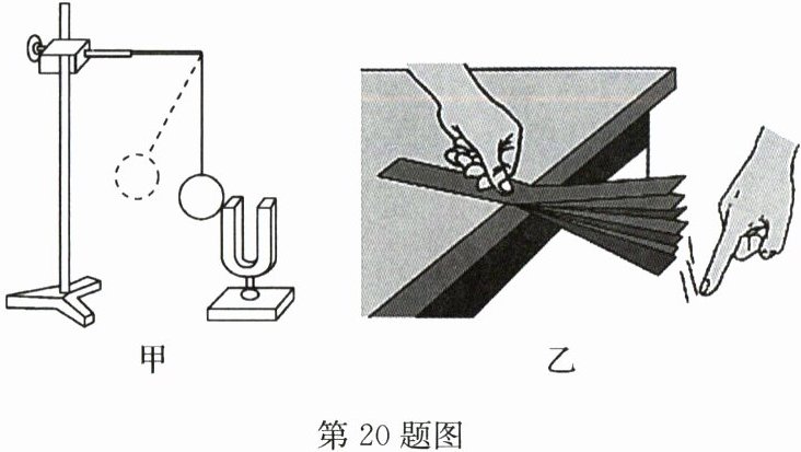 20. 小丽探究“声音的产生”时的装置如图甲所示,将系在细线上的乒乓球靠近音叉。她探究“声音的特性”时的装置如图乙所示。