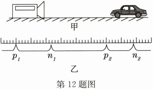 12. 如图甲所示是高速公路上用超声波测速仪测量车速的示意图。测速仪发出并接收超声波脉冲信号,根据发出和接收到信号的时间差,可测出被测物体的速度。如图乙所示,p₁、p₂是测速仪发出的超声波信号,n₁、n₂分别是p₁、p₂由汽车反射回来的信号。设测速仪匀速扫描,p₁、p₂之间的时间间隔Δt=1.0s,超声波在空气中的传播速度v=340m/s。若汽车是匀速运动的,求: