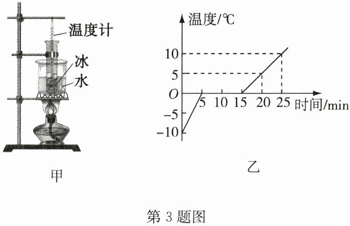 3.C 解析:由图乙知,从第5min到第15min,冰的温度保持为0℃不变,所以冰是晶体,且熔点为0℃,故A、B正确。由图知,冰从第5min开始熔化,到第15min末熔化结束,熔化过程持续了10min,故C错误。由图乙知,冰在熔化过程中不断吸热,但温度保持不变,故D正确。