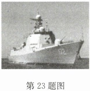 23. (6 分)如图所示,“昆明号”驱逐舰(舷号 172),是我国研制的 052D 型导弹驱逐舰。在某次演习中“昆明号”驱逐舰以 30 m/s 的速度追击前面同一直线上正以 20 m/s 的速度逃跑的敌舰。两者相距 2 km 时,“昆明号”发射一枚鱼雷,经过 50 s,舰长通过望远镜看到鱼雷击中敌舰发出的火花,同时发现敌舰正在下沉。求:(不考虑光传播的时间)
