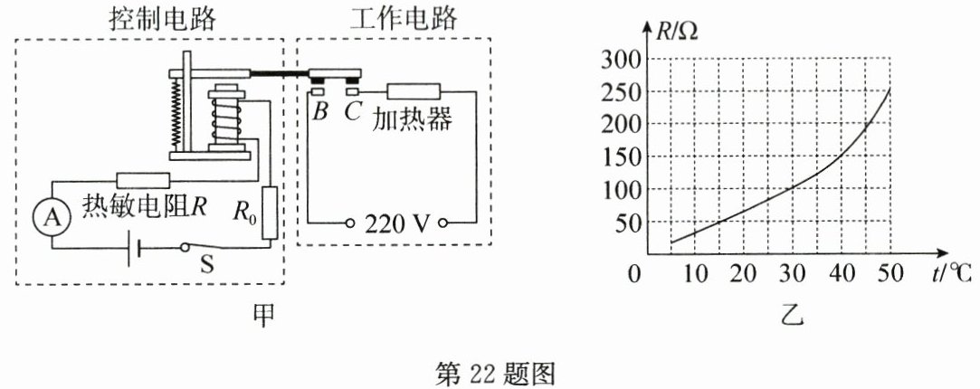 22. 实践小组为学校的花卉种植大棚设计了自动加热装置,其简化电路如图甲所示,该自动加热装置由控制电路和工作电路两部分组成,它可以使种植大棚内的温度保持在15~40 ℃,控制电路中的热敏电阻R的阻值随空气温度t的变化关系如图乙所示。当电磁铁线圈内的电流减小至0.1 A时,衔铁释放,触点B、C断开,停止加热;当电磁铁线圈内的电流增大至0.2 A时,衔铁被吸下,触点B、C接通,开始加热。已知加热器的铭牌上标有“220 V 500 W”字样,控制电路的电源电压恒定,R₀为定值电阻,电路中导线及线圈电阻不计。求: