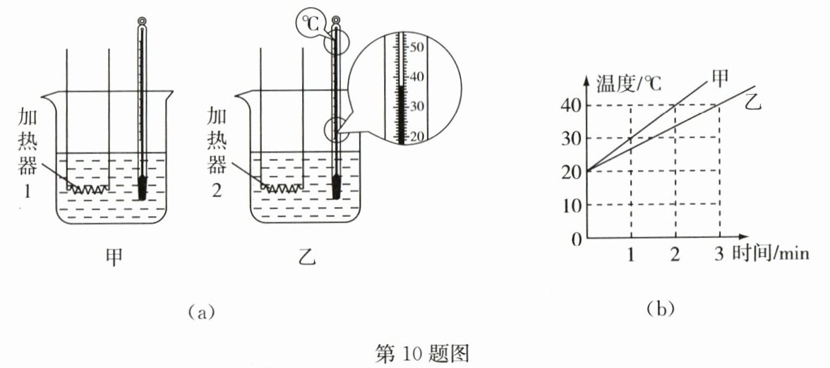 10.D 解析:由题图(a)可知,乙中温度计示数为37℃,A错;由于用不同的加热器加热,因此不能通过加热时间来比较两杯水吸收热量的多少,B错;吸收相同的热量,甲、乙两杯水升温相同,C错;由题图(b)可知,甲杯水加热2min与乙杯水加热3min升高的温度相同,并且两杯水的质量相同,根据吸热公式Q=cmΔt可知,甲杯水加热2min与乙杯水加热3min吸收的热量相同,D对。