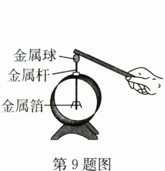 9.C 解析:若带电体带正电荷,则验电器会有一部分电子转移到带电体上;若带电体带负电荷,则这些负电荷中的一部分会通过金属杆转移到金属箔上。故选C。