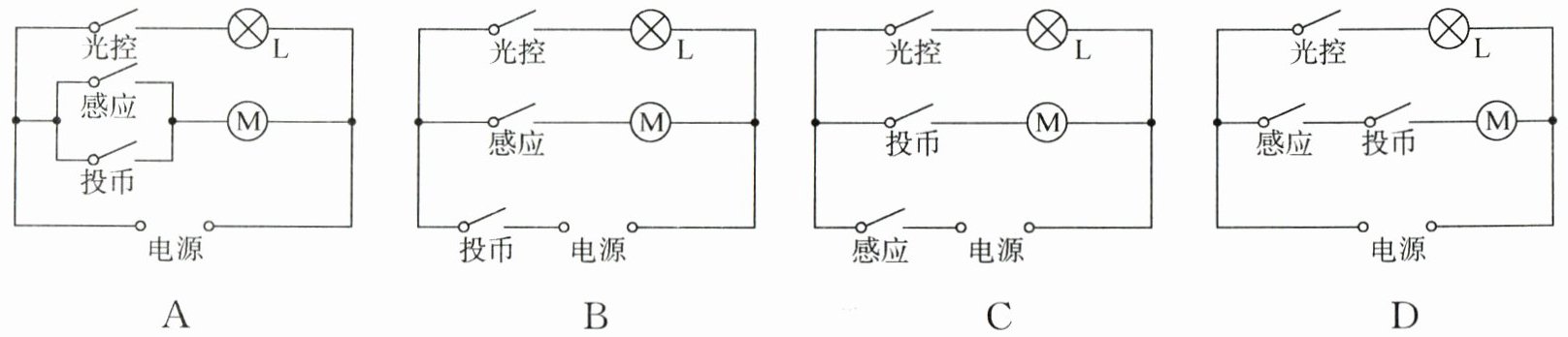 10. 小明家所在的小区安装了自动售水机。售水机既可以通过刷卡闭合“感应”开关接通供水电机取水,也可以通过投币闭合“投币”开关接通供水电机取水;光线较暗时“光控”开关自动闭合,接通灯泡提供照明。以下简化电路图中符合要求的是(