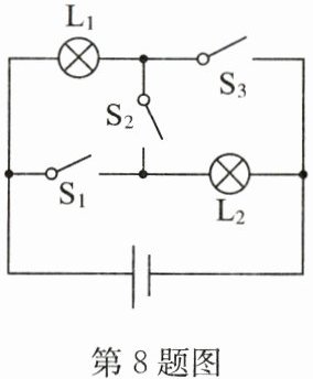 8.D解析:闭合开关S₁、S₃,断开开关S₂时,灯L₁、L₂并联,故A 错误;闭合开关S₂,断开开关S₁、S₃时,灯L₁、L₂串联,故B错误;闭合开关S₁、S₂,断开开关S₃时,灯L₁被短路不亮,灯L₂亮,故C错误;同时闭合开关S₁、S₂、S₃时,电源短路,故D 正确。