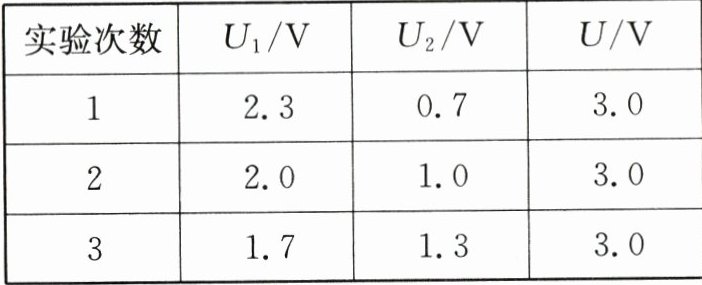 (2)用电压表分别测出L₁和L₂两端电压及电源两端电压的值,即U₁、U₂、U,经过多次实验,得到的数据记录在表中。分析实验数据,可以得到串联电路的电压特点: