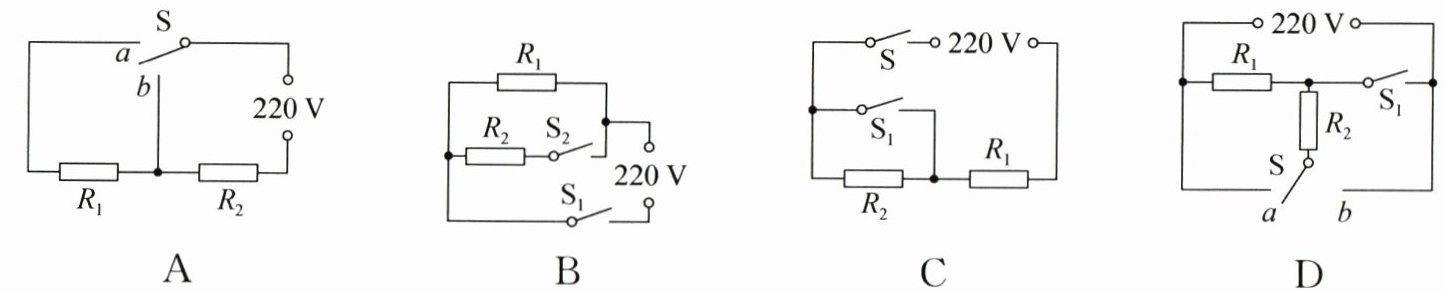 4.D 解析:A中,开关S接a时,两个电阻串联,接b时,只有电阻R₂工作,电路有两个挡位,不能调节出高、中、低三挡温度,故A不符合题意。B中,开关S₁、S₂同时闭合时,两个电阻并联,开关S₁闭合、S₂断开时,只有电阻R₁工作,电路有两个挡位,不能调节出高、中、低三挡温度,故B不符合题意。C中,开关S、S₁同时闭合时,只有电阻R₁工作,开关S闭合、S₁断开时,两个电阻串联,电路有两个挡位,不能调节出高、中、低三挡温度,故C不符合题意。D中,断开开关S₁,同时开关S₂接b,两个电阻串联;闭合开关S₁,同时开关S₂接a,两个电阻并联;只闭合开关S₁,只有电阻R₁工作。因此电路有三个挡位,能调节出高、中、低三挡温度,故D符合题意。故选D。