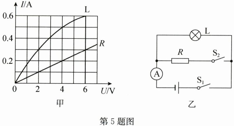 5. 图甲是灯泡L和电阻R的I-U图像,将灯泡L和电阻R接入图乙所示的电路中,电源电压保持不变。只闭合开关S₁时,电流表的示数为0.5 A。下列说法中正确的是(