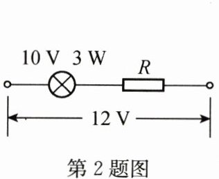 2. 把一个标有“10 V 3 W”的小灯泡和定值电阻R串联后接在电压为12 V的电源上(如图所示),小灯泡恰能正常工作。该电路工作10 s,定值电阻产生的热量是(