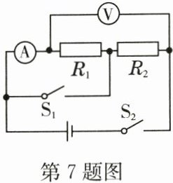 7.C 解析:当开关S₂闭合、S₁断开时,R₁、R₂串联,电源电压U=9V,$R=R₁+R₂=\frac{U}{I}=\frac{9V}{0.3A}=30Ω。$将两表互换位置,并同时闭合开关S₁和S₂,R₁、R₂并联,电压表测电源电压,示数仍为9V,R₁中电流I₁=0.5A,所以$R₁=\frac{U}{I_1}=\frac{9V}{0.5A}=18Ω,$R₂=R-R₁=30Ω-18Ω=12Ω,$P₂=\frac{U^{2}}{R_2}=\frac{(9V)^{2}}{12Ω}=6.75W。$故选C。