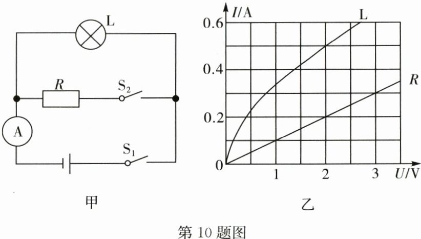 10.D 解析:只闭合开关S₁时,电路为小灯泡L的简单电路,此时小灯泡L的实际功率为1W,由题图乙可知,当U_L=2V时,I_L=0.5A,小灯泡实际功率P_L=U_LI_L=2V×0.5A=1W,则电源电压U=U_L=2V,由$I=\frac{U}{R}$可得,此时$R_L=\frac{U_L}{I_L}=\frac{2V}{0.5A}=4Ω,$故A错误;再闭合开关S₂,电阻R与小灯泡L并联,电流表测干路电流,因并联电路中各支路两端的电压相等,所以,电阻R两端的电压也为2V,由题图乙可知,此时通过电阻R的电流为0.2A,因并联电路中干路电流等于各支路电流之和,所以,干路电流I=I_R+I_L=0.2A+0.5A=0.7A,电路总功率P=UI=2V×0.7A=1.4W,故B错误;因并联电路中各支路独立工作、互不影响,所以,再闭合开关S₂,通过L的电流不变,则电流表示数的增加量即为通过电阻R的电流,其大小为0.2A,故C错误;再闭合开关S₂,在1min内电阻R产生的热量Q_R=W_R=U_RI_Rt=2V×0.2A×60s=24J,故D正确。