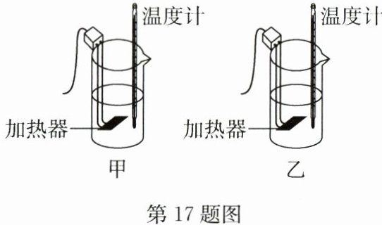 17. (16分)如图所示的是探究“不同物质的吸热能力”的实验装置,取质量均为200 g、初温均为20℃的甲、乙两种液体,分别倒入两个完全相同的烧杯中,再用相同的电加热器加热,实验数据记录如表所示。[c₁₀=4.2×10³ J/(kg·℃)]