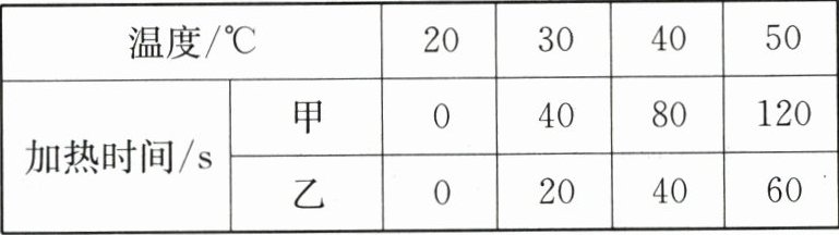 (5)由题可知,甲液体是水,当甲和乙都被加热40s时,甲、乙吸收的热量相同,即$Q_{甲}=Q_{乙}$,$m_{甲}=m_{乙}$,甲、乙温度的变化量分别为$\Delta t_{甲}=30℃ - 20℃ = 10℃$,$\Delta t_{乙}=40℃ - 20℃ = 20℃$,故乙的比热容$c_{乙}=\frac{Q_{乙}}{m_{乙}\Delta t_{乙}}=\frac{Q_{甲}}{m_{甲}\Delta t_{乙}}=\frac{c_{甲}m_{甲}\Delta t_{甲}}{m_{乙}\Delta t_{乙}}=\frac{c_{甲}\Delta t_{甲}}{\Delta t_{乙}}=\frac{4.2×10^{3}J/(kg·℃)×10℃}{20℃}=2.1×10^{3}J/(kg·℃)$。
