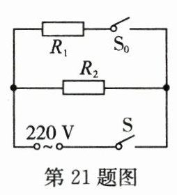 21. (9分)小波班上有一台饮水机,它的铭牌如下表所示,工作电路如图所示,S₀是温控开关,可以自动控制饮水机的加热或保温状态。求:[c₍水₎=4.2×10³J/(kg·℃)]