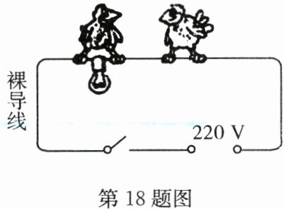 18.左边的鸟有触电危险,右边的鸟相对安全。因为左边的鸟与灯泡并联,电路一旦接通,其两脚间电压为220V,有触电危险;右边的鸟与导线并联,被导线短路,两脚之间几乎没有电压,故相对安全。