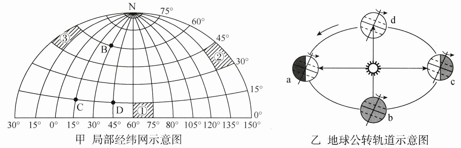 16. 读“局部经纬网示意图”和“地球公转轨道示意图”,回答下列各题。