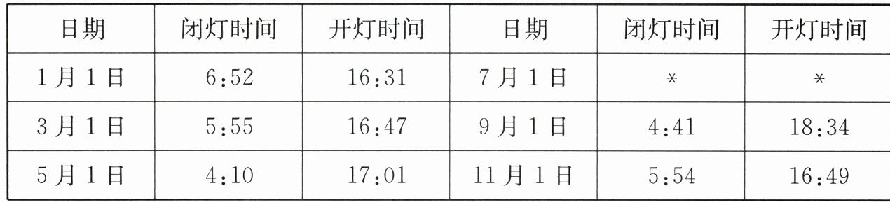 路灯对人们夜间出行有巨大作用,路灯通常在日出前关闭,在日落后开启。读长春市2021年部分月份1日路灯关闭及开启时间表,完成14~15题。