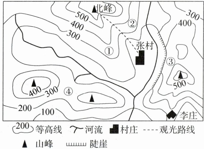 13. 导游小张带领游客从张村出发去北峰观光,张村与北峰的相对高度可能是(
