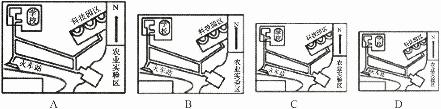 (4)依据农业实验区在学校的正东方向,在图乙中的右上角空白处用箭头“→”画出指向标即可。由此判定科技园区在火车站的东北方向,学校在科技园区的西南方向。