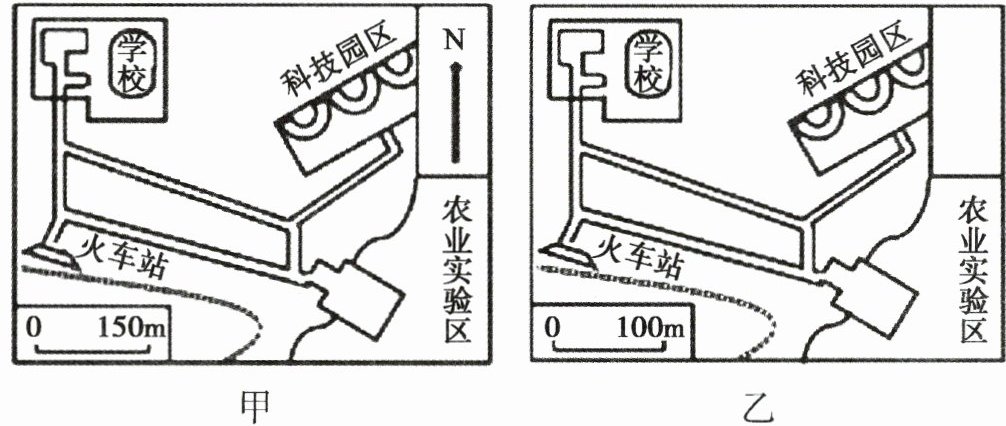 (2)由比例尺=图上距离÷实地距离,可得实地距离=图上距离÷比例尺。图甲中,小明测得学校到科技园区的图上距离约3厘米,那他从学校到科技园区大约走3×150=450米。