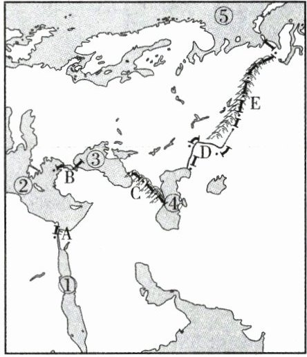 (3)苏伊士运河 土耳其海峡 大高加索山脉 乌拉尔河 乌拉尔山脉