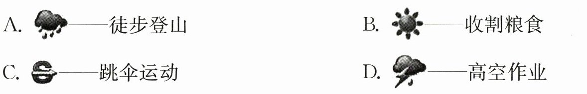 2.B 解析:A是暴雨天气,不适合外出,更不能徒步登山;B是晴天,适合收割粮食;C是沙尘暴天气,发生沙尘暴时空气质量极差,不能进行户外运动,如跳伞运动;D表示的是雷电天气,雷电天气下不能进行高空作业。故选B。