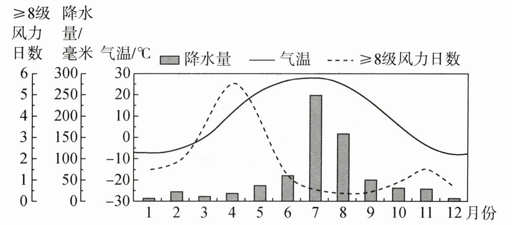 11.D 解析:根据图中数据无法计算气温日较差;北半球的3、4、5月为春季,图中显示春季风力大,降水少,夏季风力小;该地最高月气温约为29℃,最低月气温约为-7℃,气温年较差为29-(-7)=36℃;图中显示7、8月的降水量加起来占全年降水的一半以上。