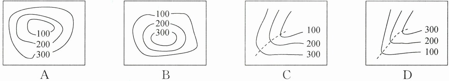 5.C 解析:读图可知,A图中等高线数值中间小,四周大,表示的是盆地;B图等高线数值中间大,四周小,表示的是山峰;C图中等高线的弯曲部分凸向数值大处,表示的是山谷;D图中等高线的弯曲部分凸向数值小处,表示的是山脊。故选C。