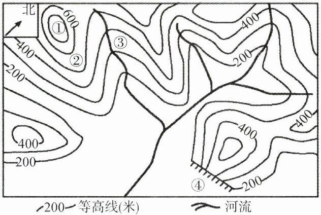 3.A 解析:图中①处等高线闭合,数值中间大四周小,为山峰;②处等高线的弯曲部分向海拔低处凸,为山脊;③处等高线的弯曲部分向海拔高处凸,为山谷;④处等高线重叠,为陡崖。