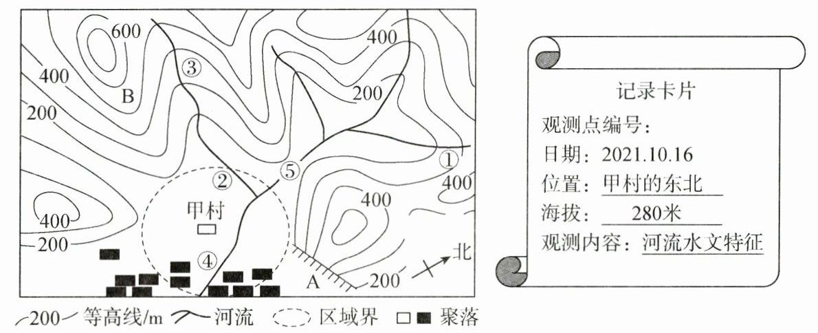 4. 某中学地理学习兴趣小组组织了一次山区的野外实习。下图是该山区的部分等高线示意图和某观测点记录卡片,读图,完成(1)~(4)题。
