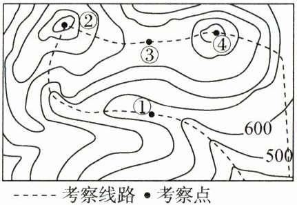 10. 下图是某学校研学旅行考察线路图,图中①②③④四处,需涉河经过的考察点最有可能是(