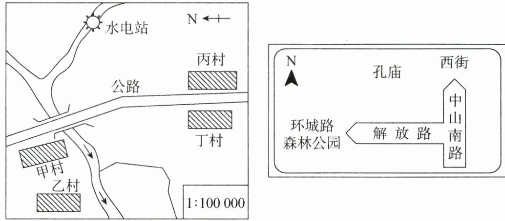 (1)地图的三要素是方向、图例、比例尺。读图可知,两图都有指向标,应根据指向标辨认方向,指向标箭头一般指向北方。根据指向标,左图中箭头所示小河是自东北向西南方向流的。由图中指向标可知丙村在丁村的正东方向。