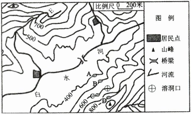 (1)据图可知,溶洞口所在地海拔为600米,其下坡约200米的地方是A地。
