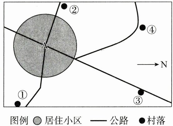 下图为我国某乡镇新农村建设示意图,图中以A地为中心3千米内建为居住小区,居住小区半径的图上距离大约为1厘米。读图,完成1~2题。
