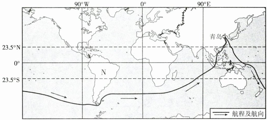 我国帆船手驾驶“青岛号”帆船,实现了中国人首次单人不间断环球航海的壮举。读航程及航向示意图,完成11~12题。