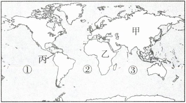 10.C 解析:地球表面由海洋与陆地构成,有“三分陆地、七分海洋”的说法,故A错误。甲是世界上跨纬度最多的大洲——亚洲,乙是非洲。面积最大的大洲是亚洲,故B错误。①是美洲西部的太平洋,②是美洲东部的大西洋,③是非洲东部的印度洋,故C正确。丙是巴拿马运河,是北美洲与南美洲的分界线,故D错误。故选C。