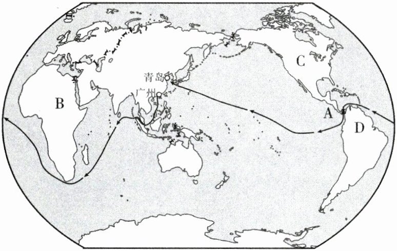 16. 地理课上,科考组为了探究世界大洲和大洋的分布,模拟了“大洋一号”的航线(如下图所示):从广州起航,穿越印度洋、大西洋和太平洋三大洋,最后到青岛。结合下图,回答下列问题。