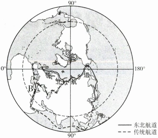 读东北航道和传统航道示意图。结合材料,完成14~15题。