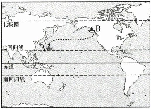 某电影讲述了一个少年出海遭遇风暴后,与一只孟加拉虎共同漂流的经历。下图中 A 是漂流的起点,B 是漂流的终点。读图,完成 3~4 题。